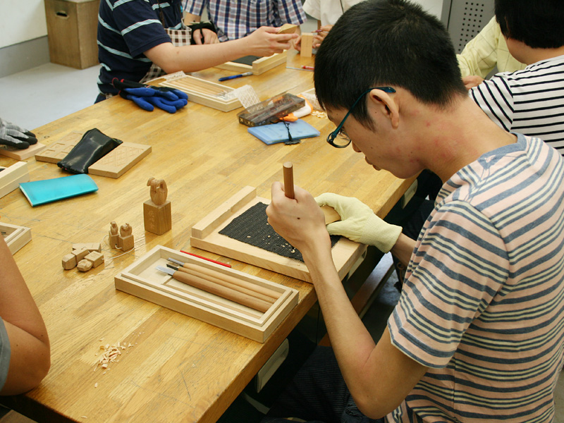 初めは三角形や四角形などの簡単な図形から彫っていただきますが、慣れてくるとお盆やお皿への線彫り、地紋彫り、更には立体へと挑戦したいものに取り組んでいただきます。